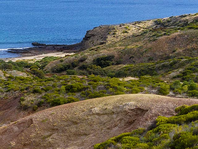 This display is a selection of 18 photographs taken during one trip to Hallett Cove Conservation Park, a region of native coastal land south of Adelaide. The park has a number of interesting geological features, and has a marvellous atmosphere of freedom about it. It is a favourite place for me to go to and walk around in. It has well constructed walkways and interesting scenes everywhere. The landscape feels raw and free, and ancient, yet very much immediate. It is pleasing that such an area of land is kept in this way, instead of just letting developers destroy it so they can extend suburbia over it. The park is surrounded by suburbia, but fortunately, when one is inside the park, it feels like one has gone to a very special place, away from suburbia. |