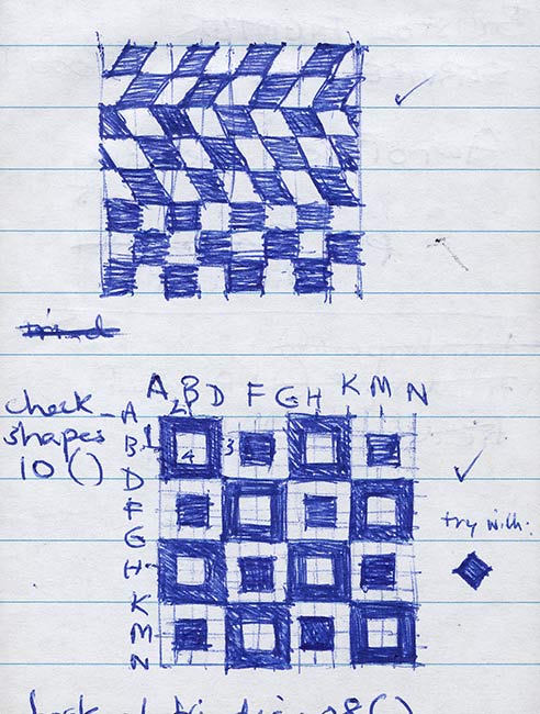 The blue tick next to the design just means that I intend to reproduce this design formally (using either one of my programs written using Processing 3.0, or produced using Inkscape, a similar program to Adobe Illustrator). My notebooks now contain many designs, and this was a simple way of choosing the most interesting designs. The red tick indicates that I have reproduced this design formally. I haven't always gone back and ticked off the designs that I have reproduced formally. I have, however, formally reproduced all of the designs shown on this page. |