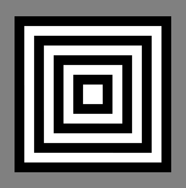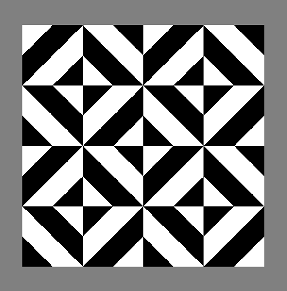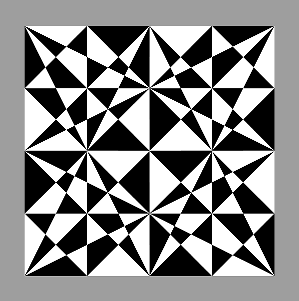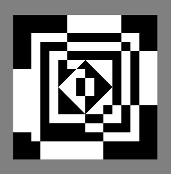Each of the images shown on this page was rendered in InkScape from a Scalable Vector Graphics (SVG) file. These vector graphics files contain mathematically defined versions of the designs that can be enlarged to any size you would like, with no degradation in line quality. They could be printed out as posters or billboards and still have very clean sharp lines, and excellent precision. It is exciting seeing the precision and geometry of these images. A border of mid grey was set up on the master file (used as the starting point for all of the designs produced), so that all of the developed designs had a grey border outlining the designs. InkScape enabled me to develop the designs using combinations of many layers of shapes. The program allows me to switch on or switch off any layer I wish to see, or hide. I found that I could easily explore trying various combinations of many layers, using a layer combining mode that would reverse the tones for overlapping shapes. For these designs, I only used black and white tones (with the grey border surrounding each design). |