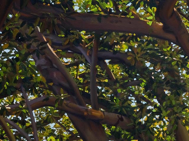 I realised when I first came across the tree in 1983 that it was an excellent place to be at, but now see just how special that one tree is. It is a huge tree, with branching very close to the ground. Most people can easily get amongst its massive boughs and the spaces between them. That is something very unusual in itself. But the tree also has a vast network of twisting buttress roots sitting up from the ground that makes it feel like an inviting playground. Being close to the tree means being in a changed environment; heavily darkened by the thick canopy of rubbery leaves, surrounded by many active birds with tropical calls in the canopy, amongst pleasant earthy smells of rotting figs and decaying leaves, and an atmosphere where my senses seem to be heightened (there are masses of interesting details everywhere I look). It feels special to have free access to the Adelaide Park Lands. They are an amazing resource, surrounding the City of Adelaide. I am glad and feel proud that the City of Adelaide values and protects this precious and unique resource. The actual painting looks and feels much better than the reproduction here.