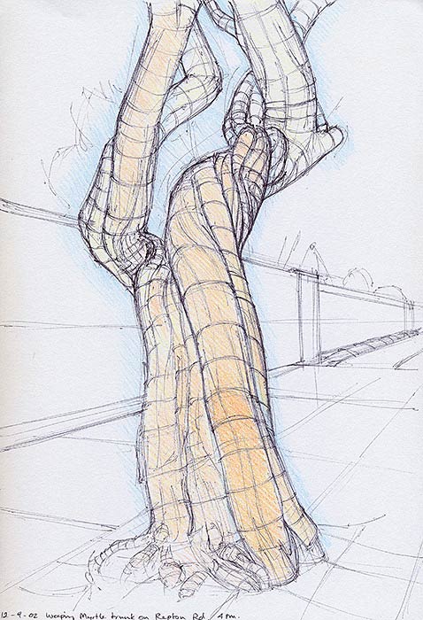 Drawn on-site, near home. Here, I wanted to draw the twisting, meandering, tubular forms within this Weeping Myrtle trunk (growing by the side of the road within suburbia). The movements of form within the trunk’s forms are very expressive of being part of an old watercourse. The colour work, done using high quality watercolour pencils, was added to reinforce the expression of forms and the expression of space around the forms. Surfaces that are close to me have been coloured to be more orange. Pale blues have been applied to indicate the air that sits behind forms.