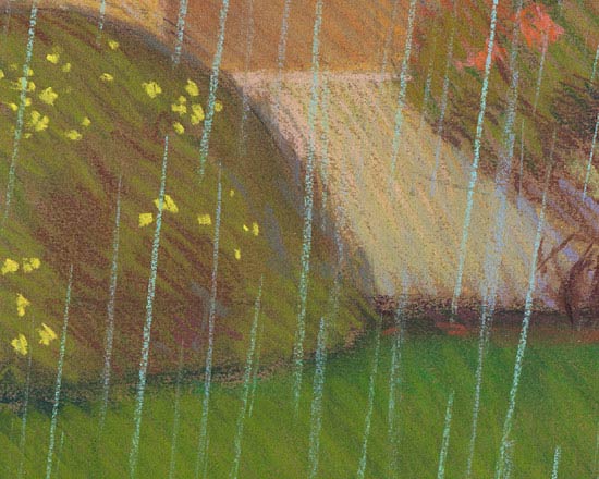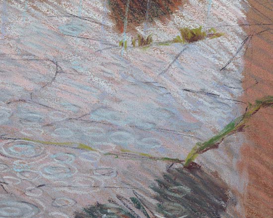 Drawn on-site, looking out from my studio. I am very pleased with the feeling of rain, overcast light, and reflection that come back from this piece. At the time, I had one day a week in which I set aside for doing my artwork. I had been looking forward all week to getting out and continuing work on a different drawing that I had started the week before, but the weather dictated a major change in plans. I know that in putting together some of the elements of this image, I used considerable influence from the many computer paintings I had done in recent years, especially in exaggerating the rings created by the drops of rain.